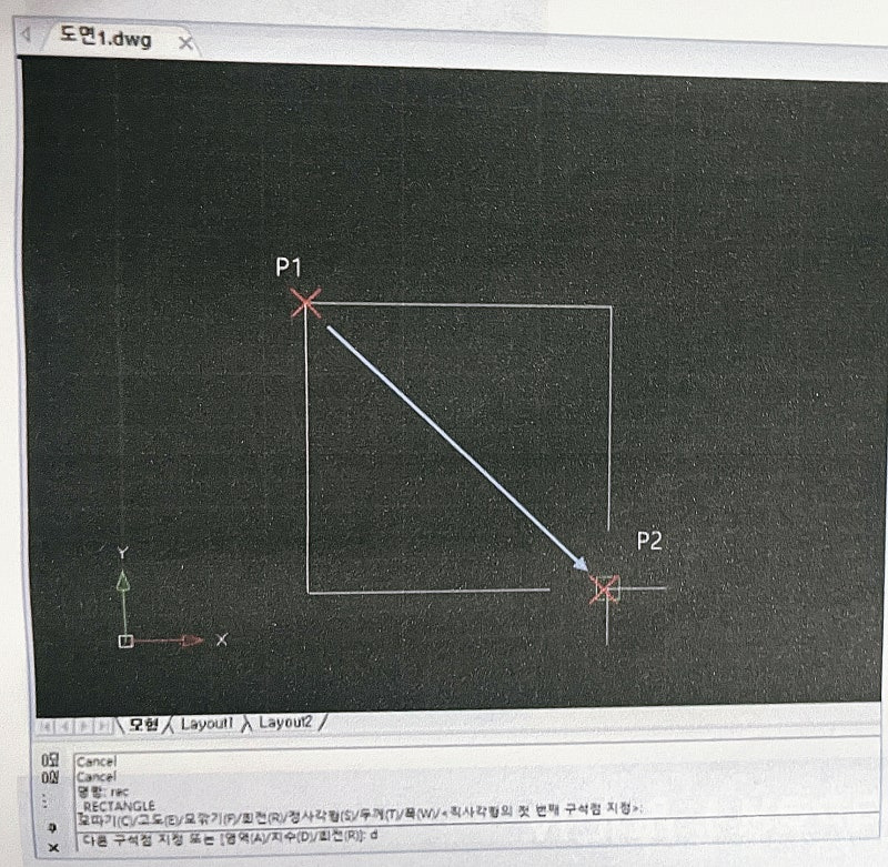<직사각형의 첫 번째 구석점 지정> : P1 클릭
